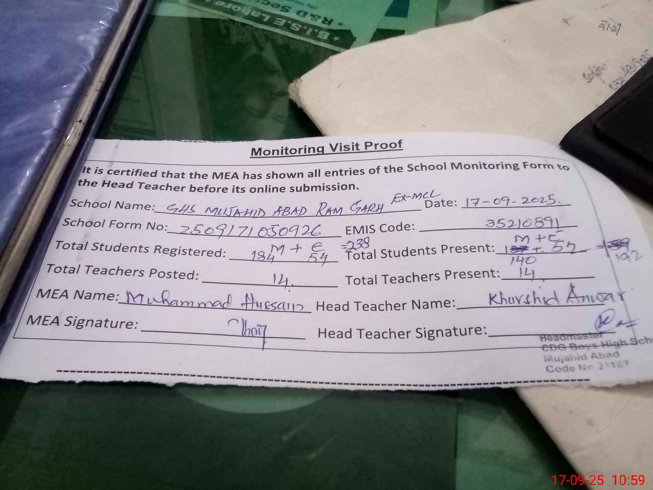 | Attendance Register | Head Teacher | MEA with School | Visit Proof |