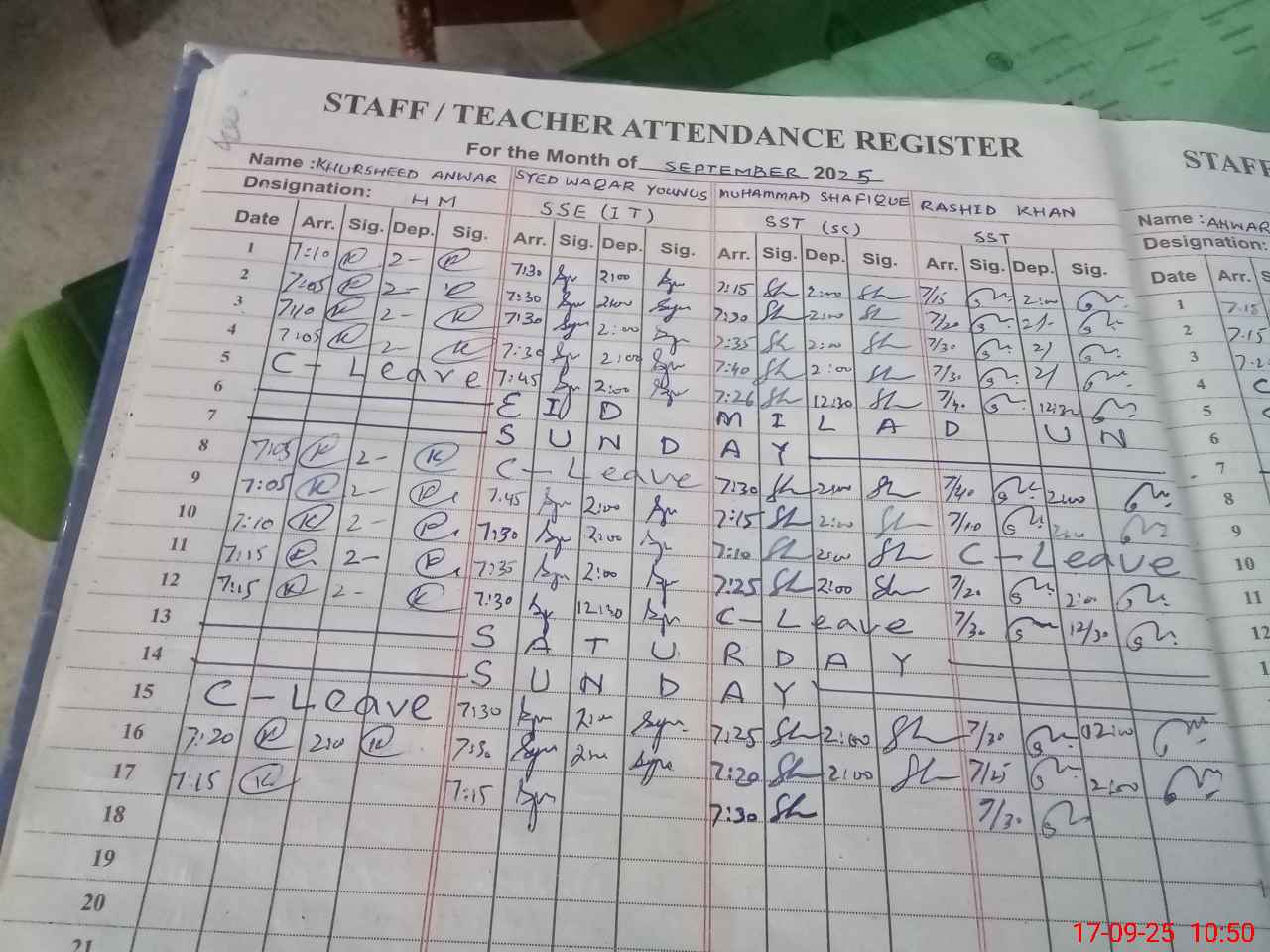 | CNIC | Full Name | Designation | R/C | Absence During Last Calender Month |