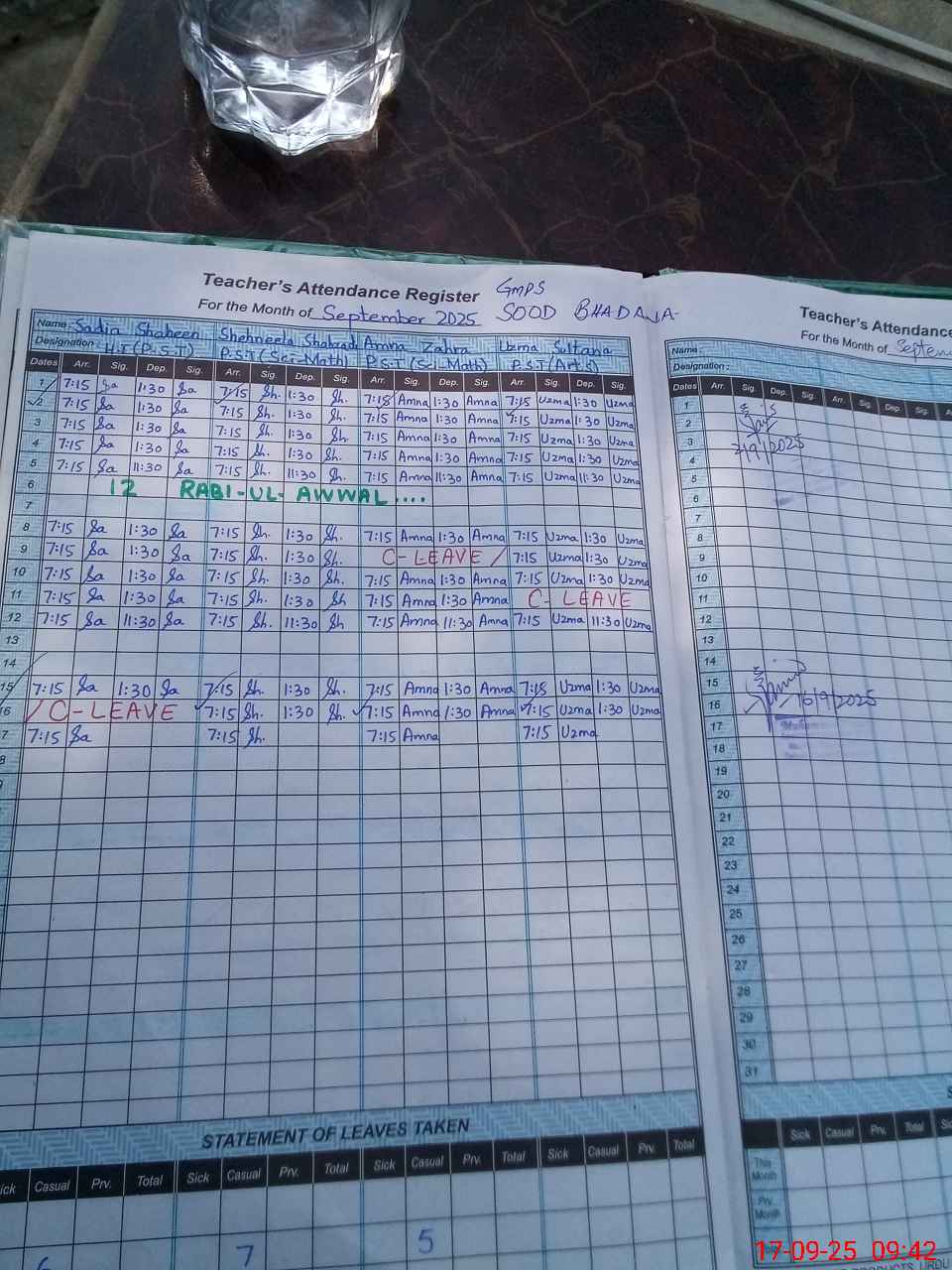 | Monitoring Date: 17-09-2025 | Start Time: 17-09-2025 09:31 AM | End Time: 17-09-2025 09:52 AM | Name of MEA: Kh**** Ri**** | |
