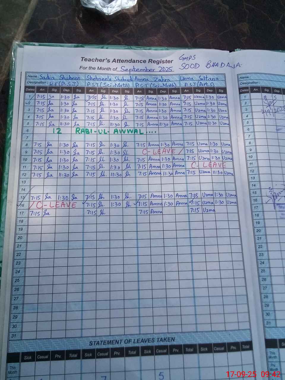 | Leave | Duty | Absent | Maternity | Medical | Ex- Pak |