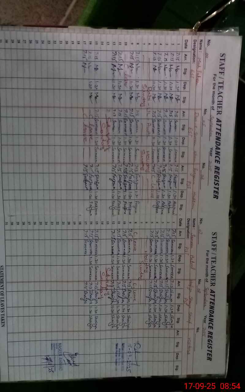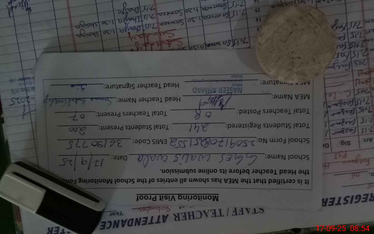 | Attendance Register | Head Teacher | MEA with School | Visit Proof |