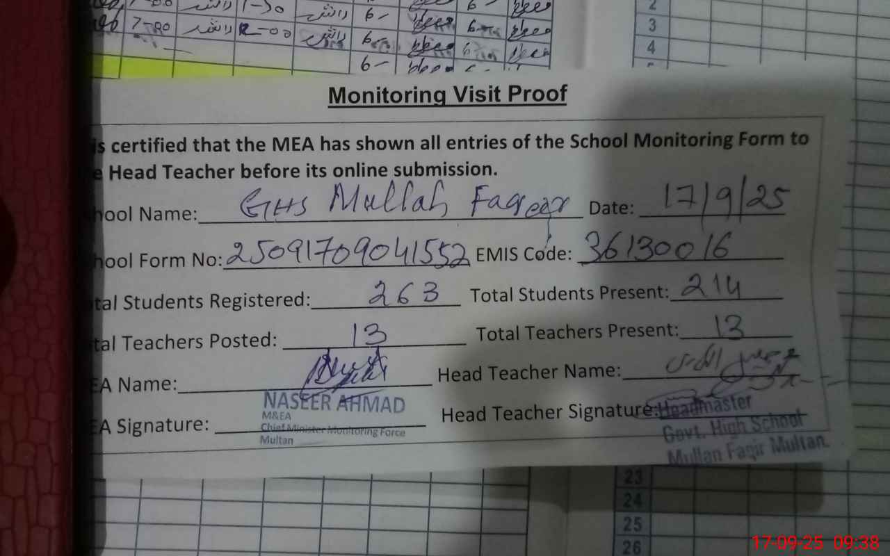 | EMIS Code: 36130016 | Name of School: GHS MULLAN FAQIR BUDHLA MULTAN | |||