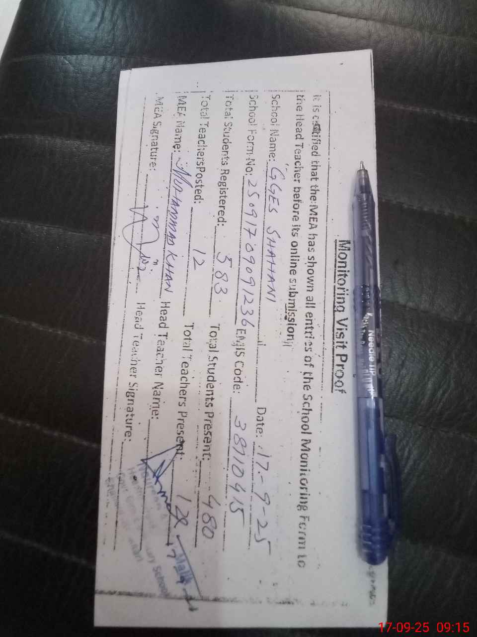 | Attendance Register | Head Teacher | MEA with School | Visit Proof |