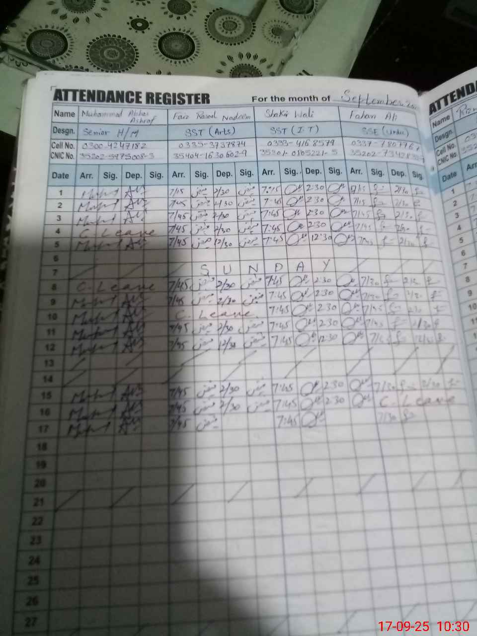 | CNIC | Full Name | Designation | R/C | Absence during last cal. month |
