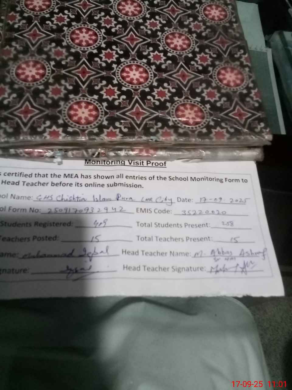 | EMIS Code: 35220020 | Name of School: GHS CHISHTIA ISLAM PURA LAHORE CITY | |||