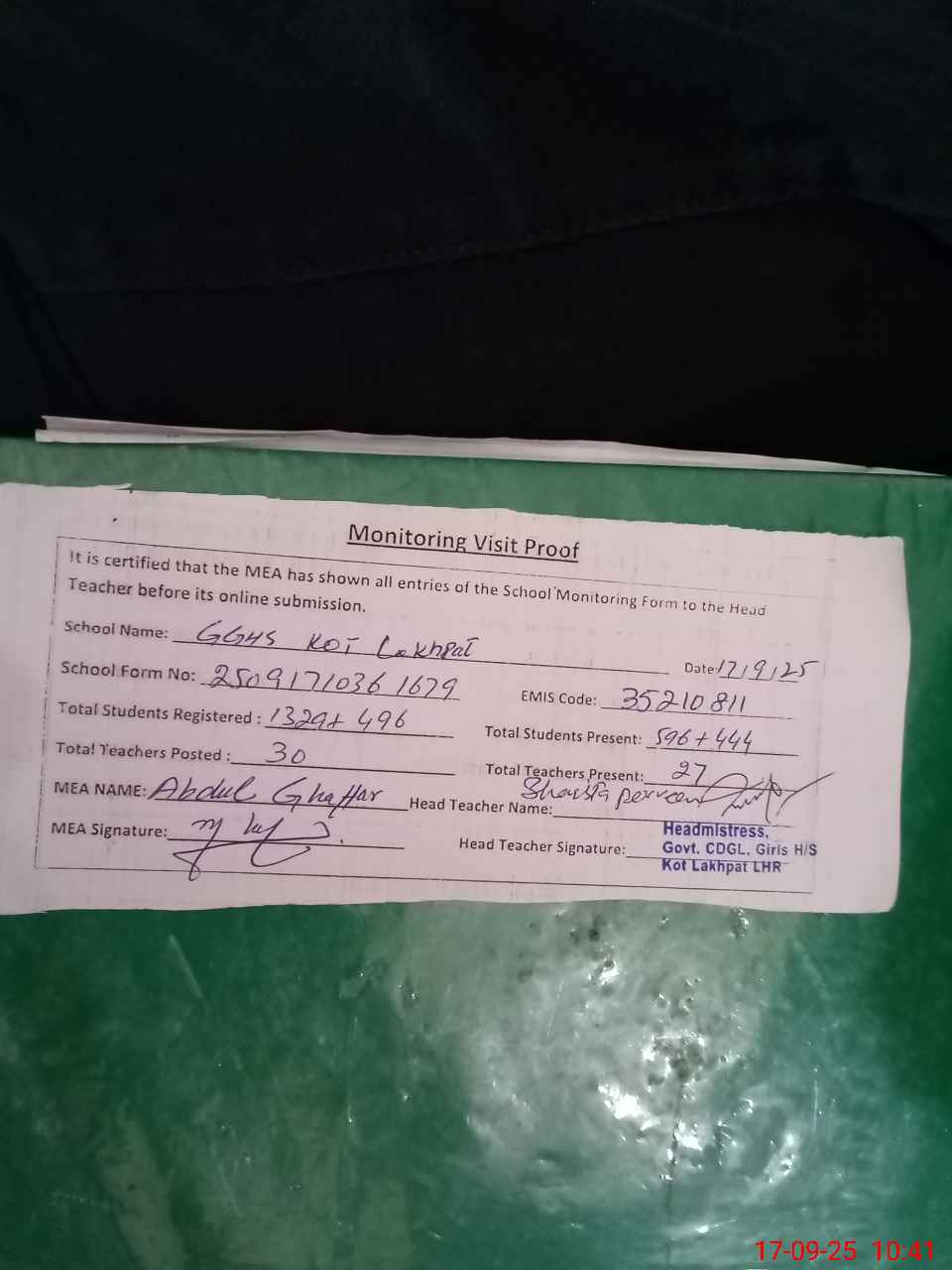 | EMIS Code: 35210811 | Name of School: GGHS KOT LAKHPAT AKBAR SHEED ROAD (EX-MCL) | |||