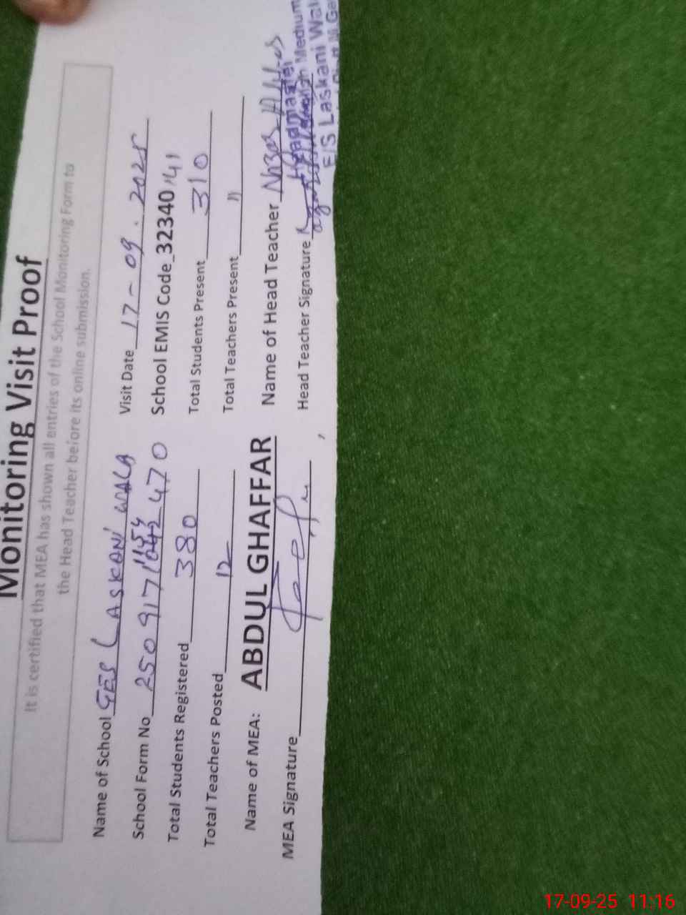 | Attendance Register | Head Teacher | MEA with School | Visit Proof |
