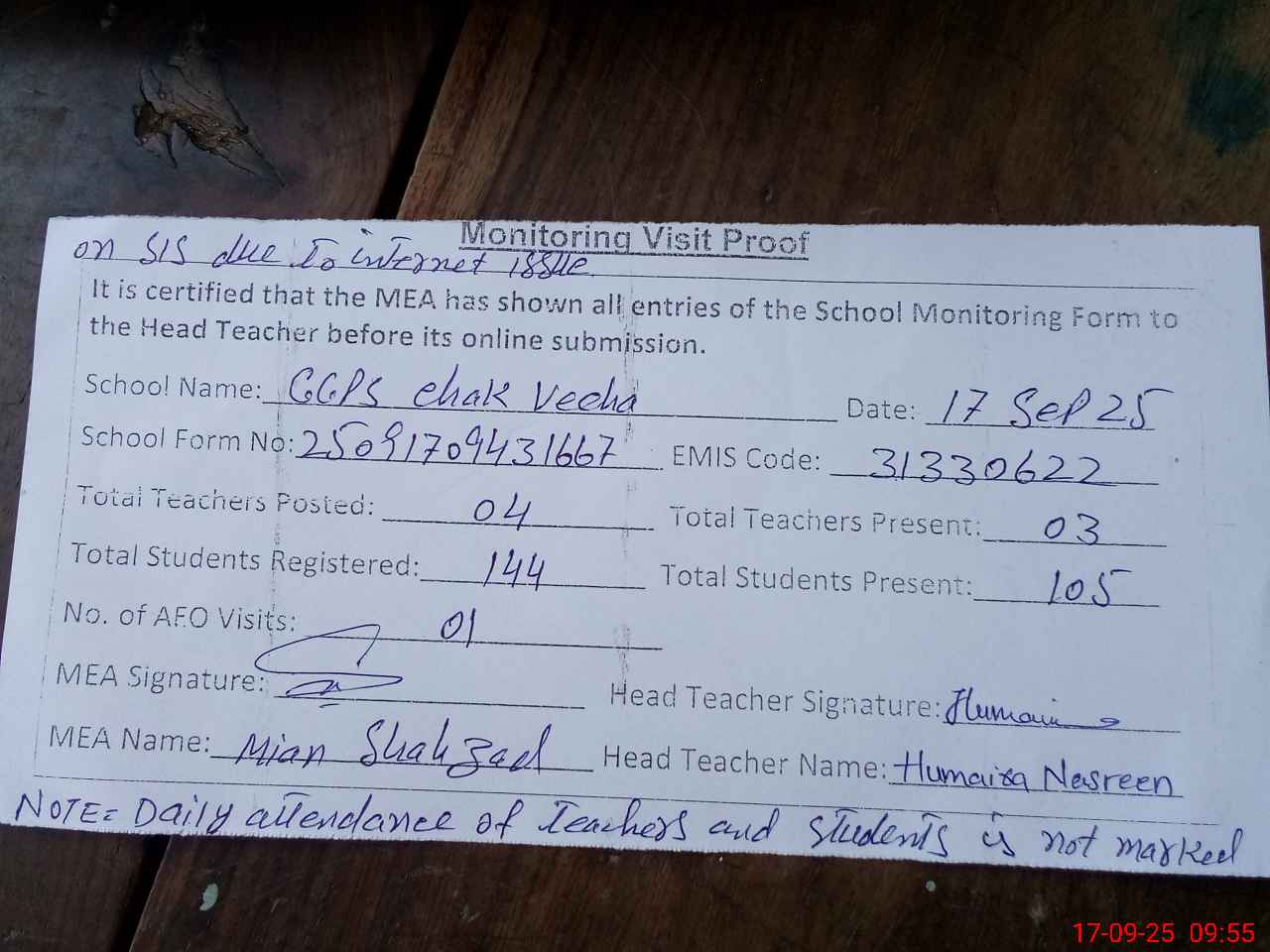 | EMIS Code: 31330622 | Name of School: GGPS CHAK VEEHA | |||