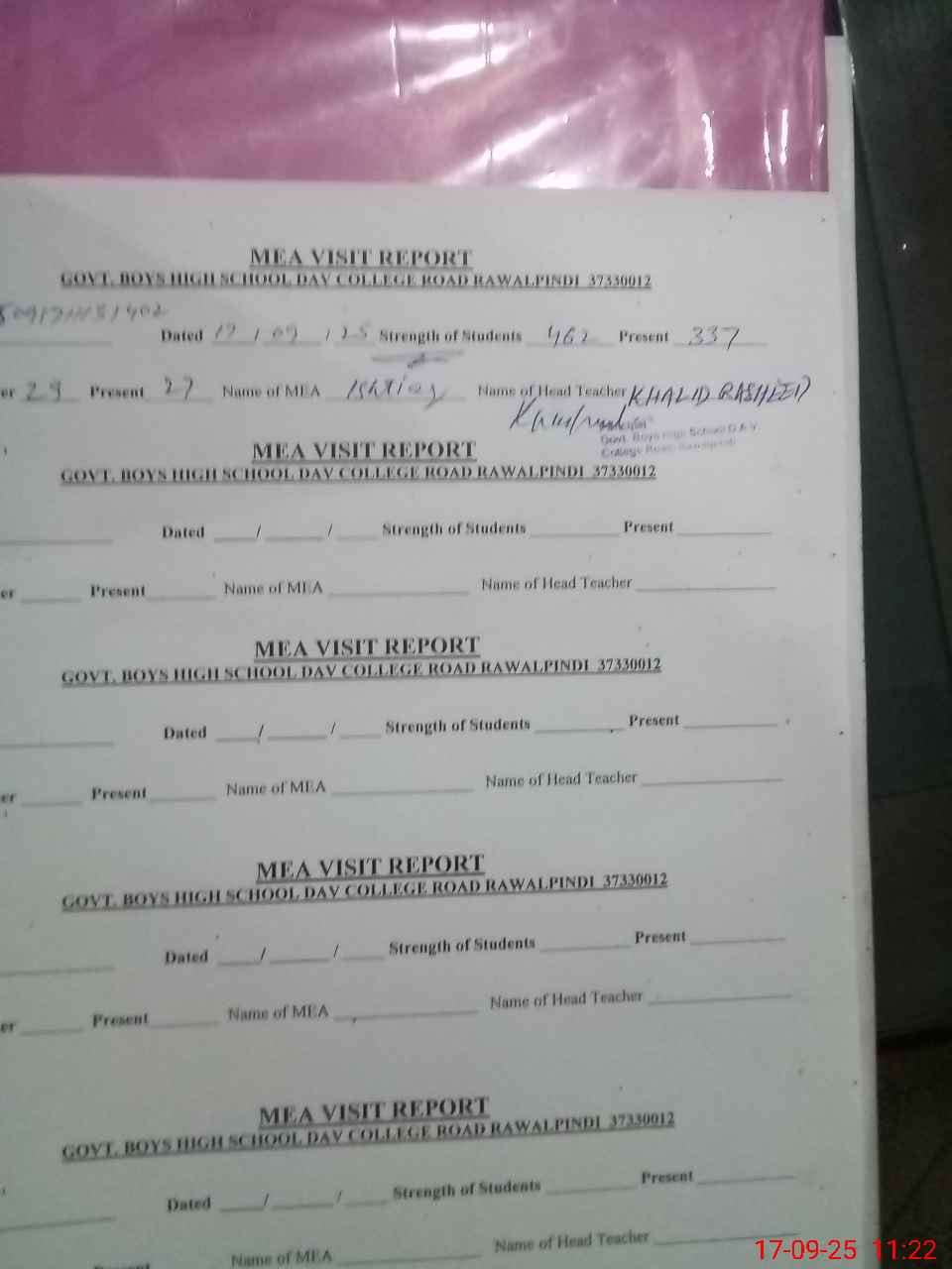 | Attendance Register | Head Teacher | MEA with School | Visit Proof |