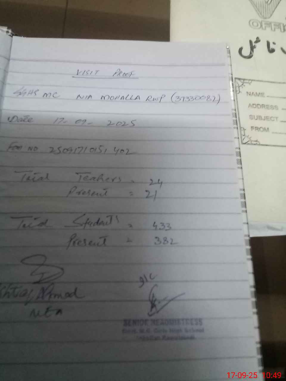 | Attendance Register | Head Teacher | MEA with School | Visit Proof |