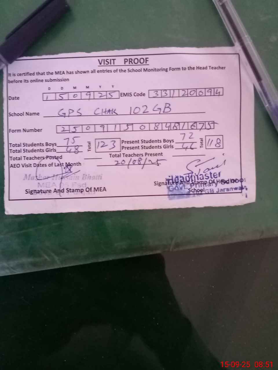 | EMIS Code: 33120094 | Name of School: GPS CHAK 102 GB | |||