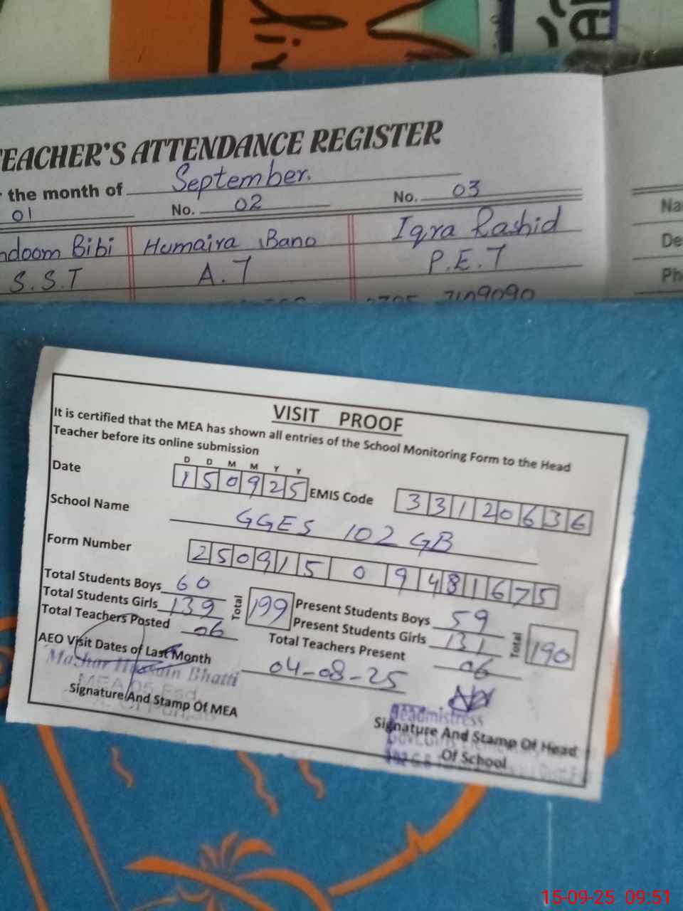 | Attendance Register | Head Teacher | MEA with School | Visit Proof |