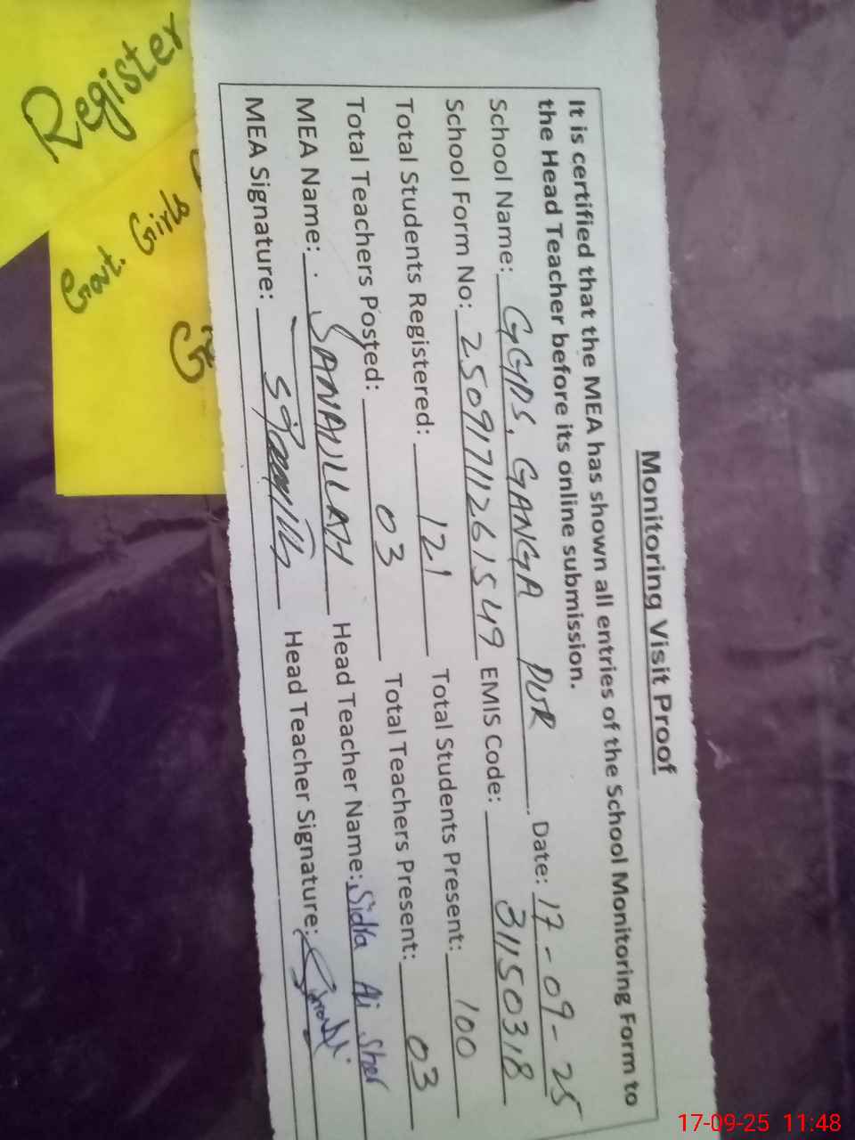 | EMIS Code: 31150318 | Name of School: GGPS GANGA PUR | |||