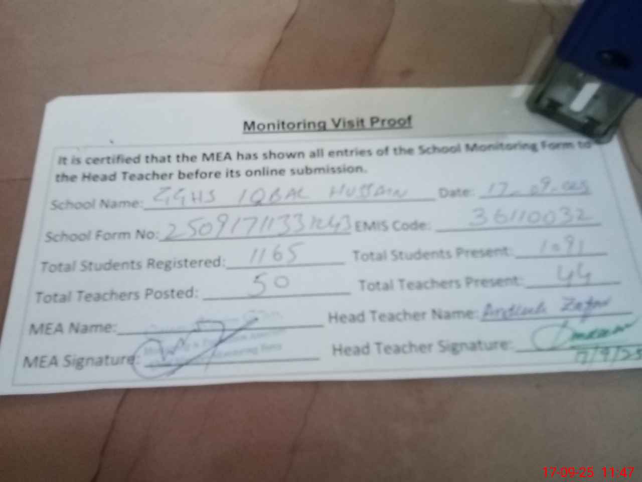 | Attendance Register | Head Teacher | MEA with School | Visit Proof |