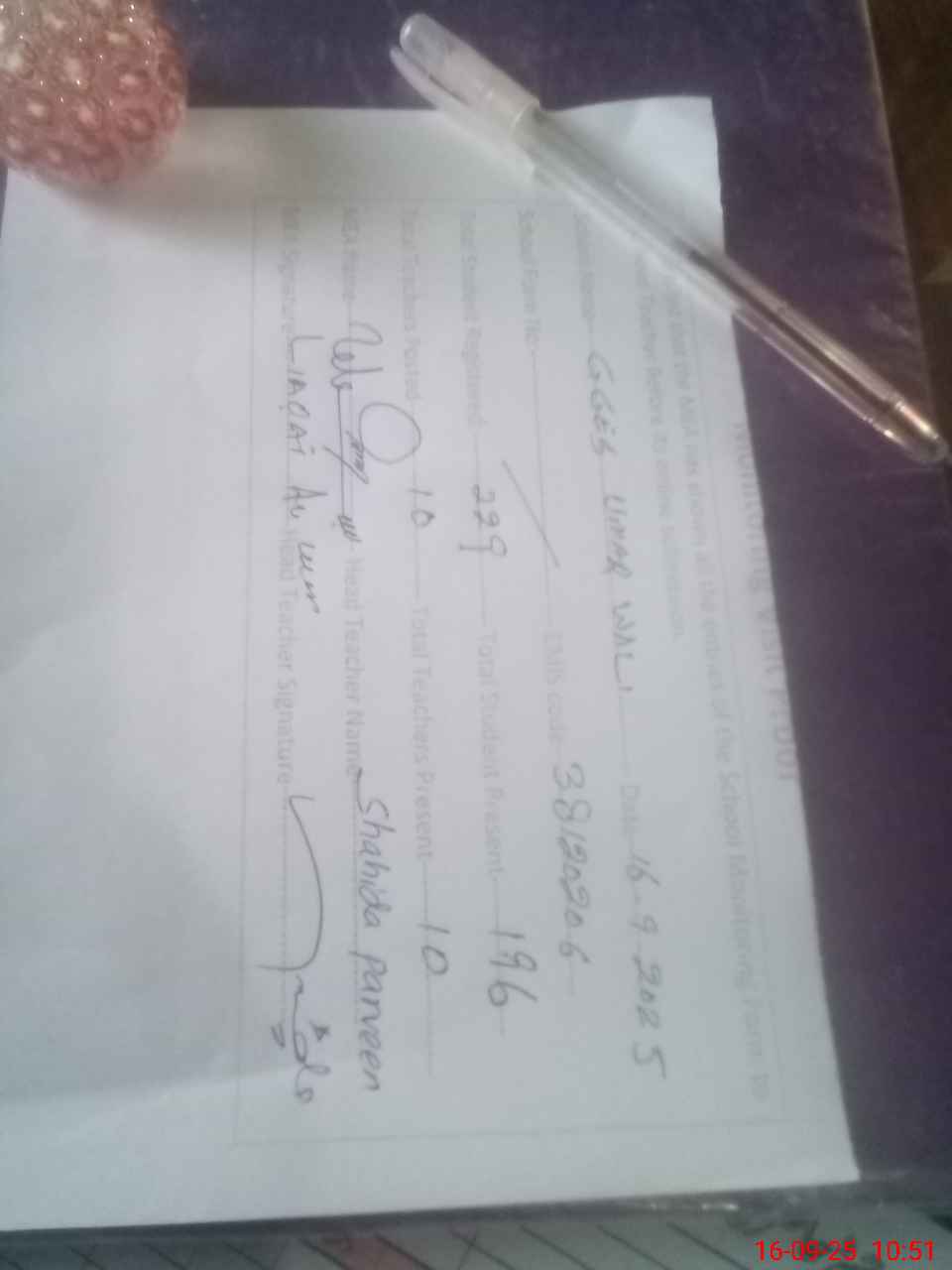 | Attendance Register | Head Teacher | MEA with School | Visit Proof |