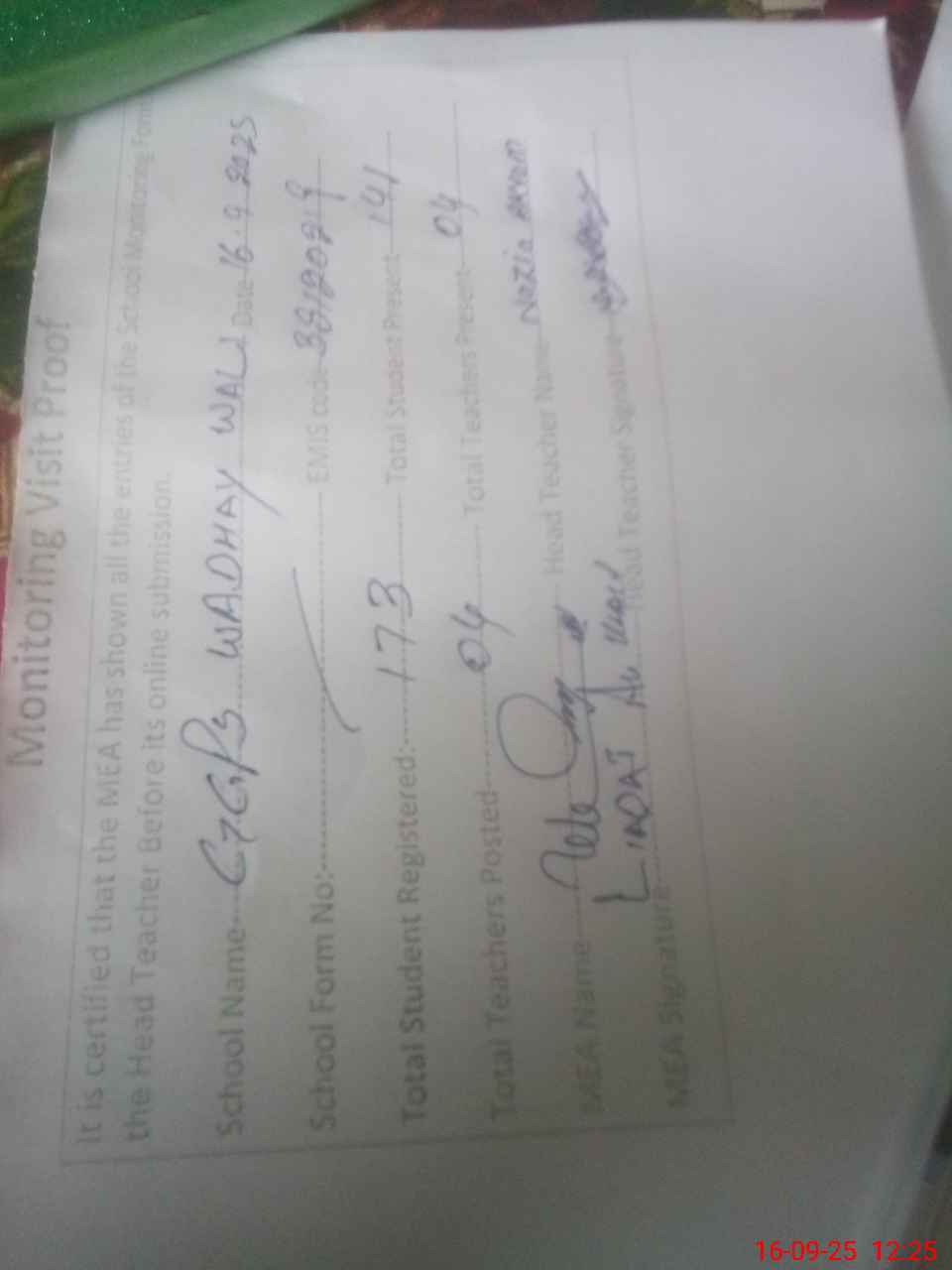 | Attendance Register | Head Teacher | MEA with School | Visit Proof |