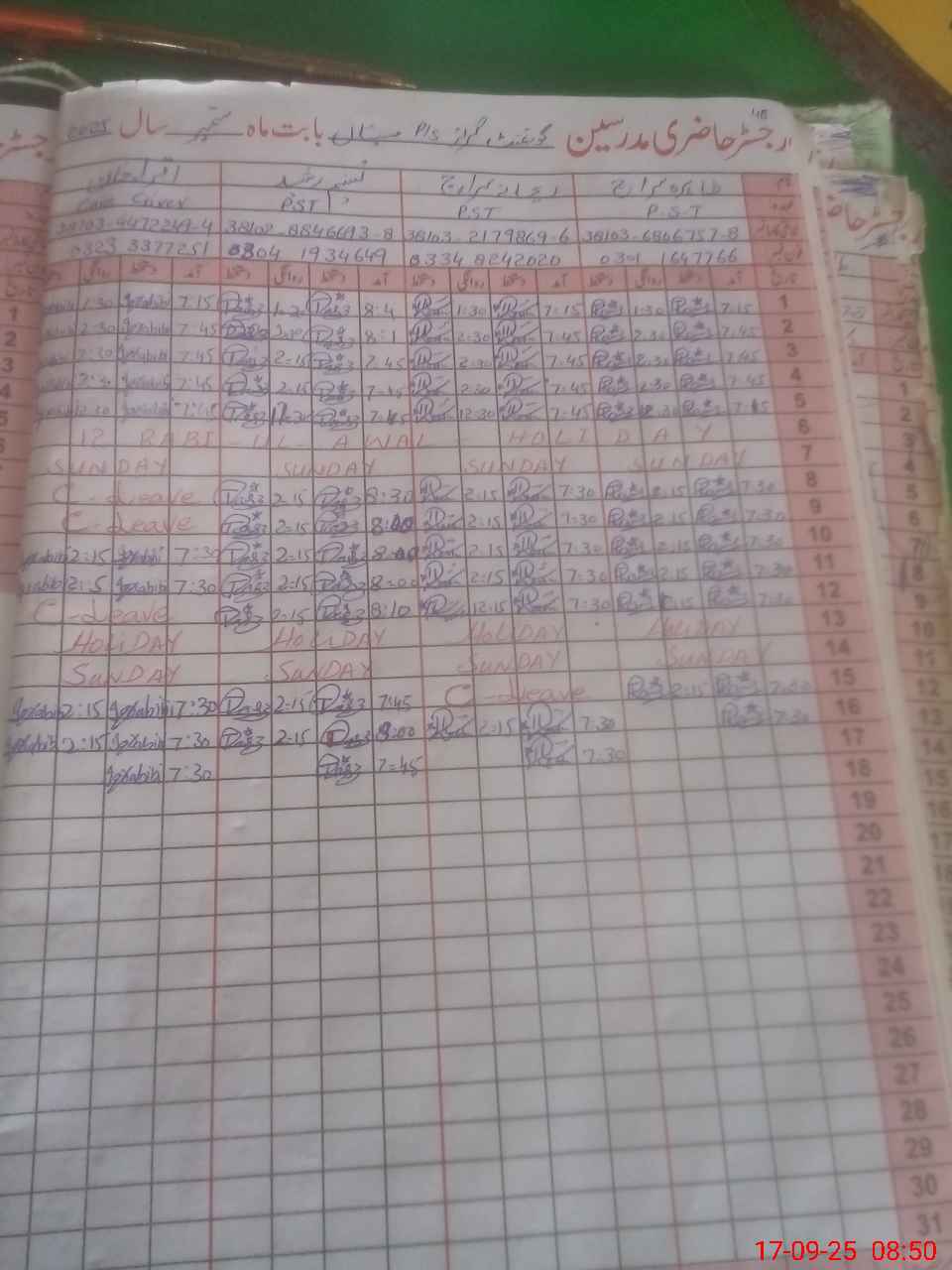| CNIC | Full Name | Designation | R/C | Absence During Last Calender Month |