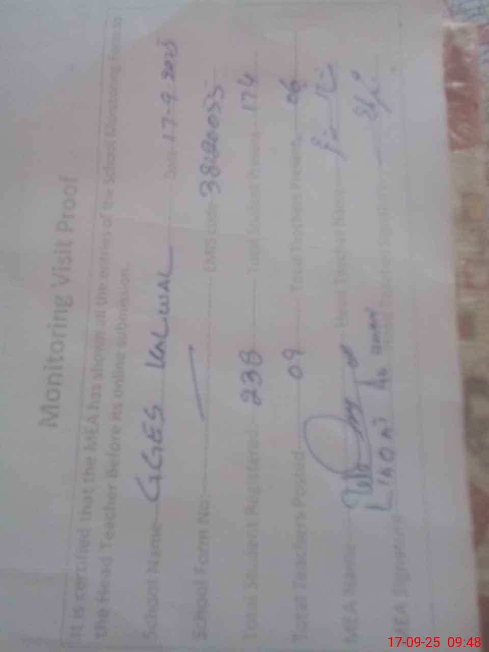 | Attendance Register | Head Teacher | MEA with School | Visit Proof |