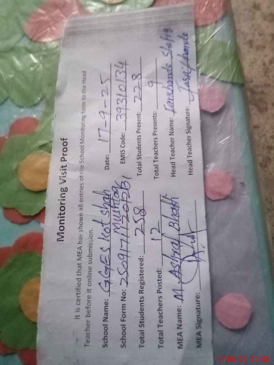 | Attendance Register | Head Teacher | MEA with School | Visit Proof |