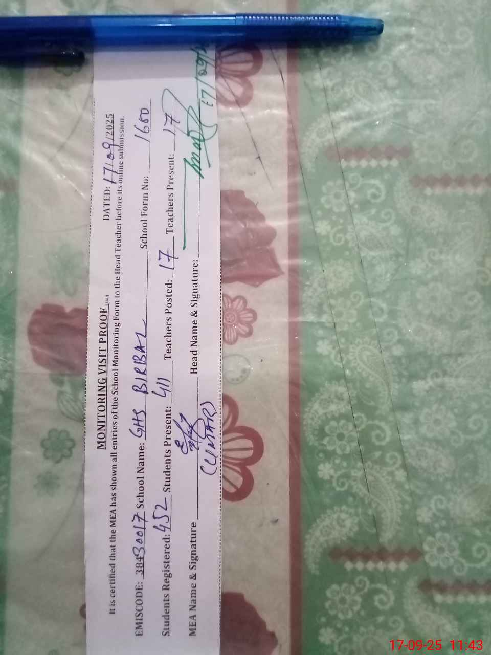 | Attendance Register | Head Teacher | MEA with School | Visit Proof |