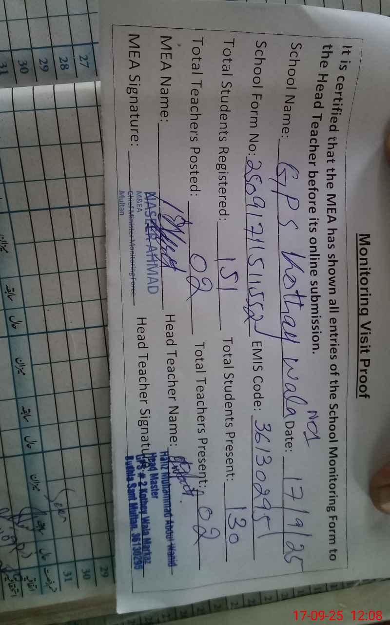 | EMIS Code: 36130295 | Name of School: GPS KOTHEY WALA NO. 2 MULTAN | |||
