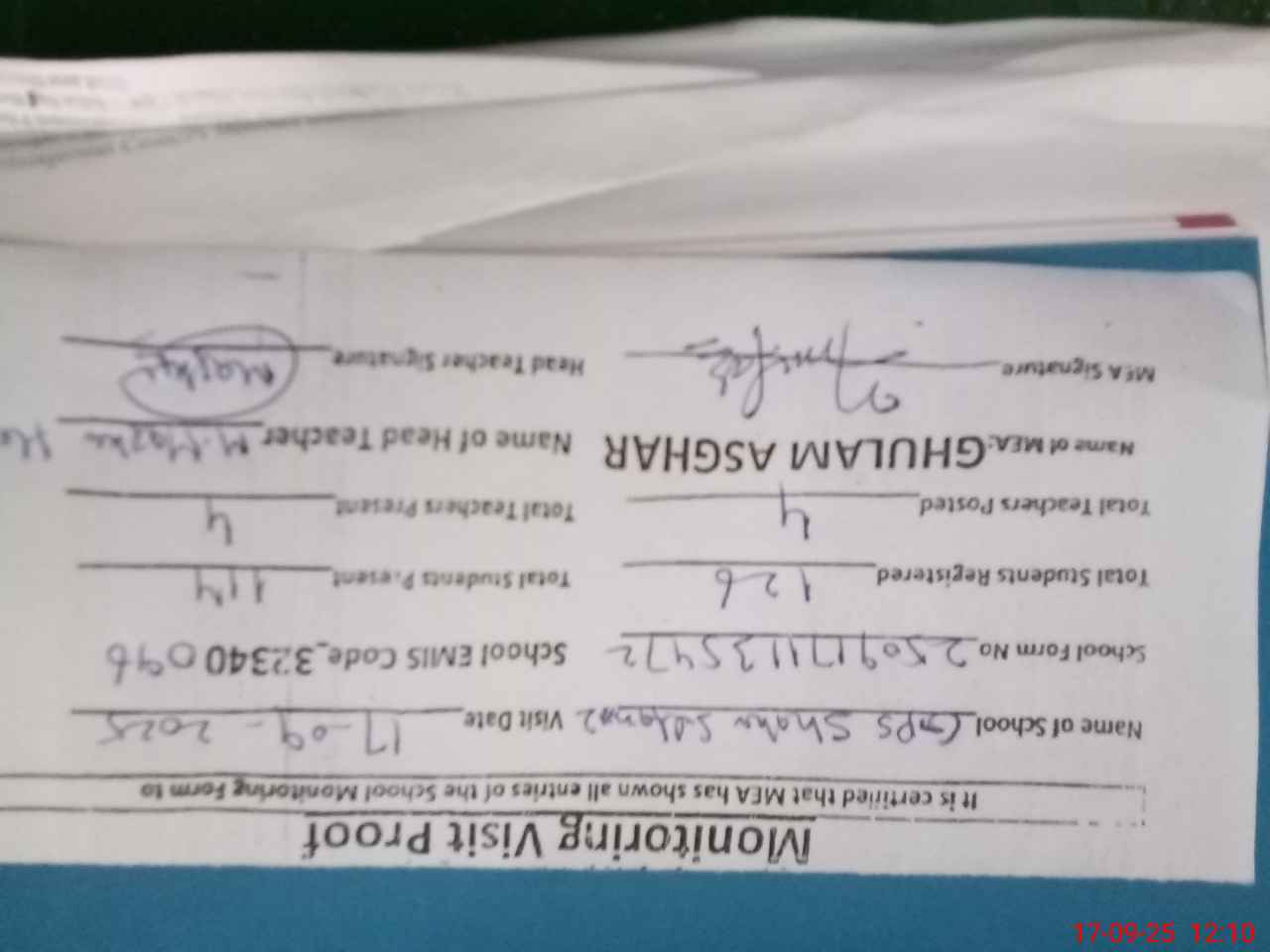 | Attendance Register | Head Teacher | MEA with School | Visit Proof |