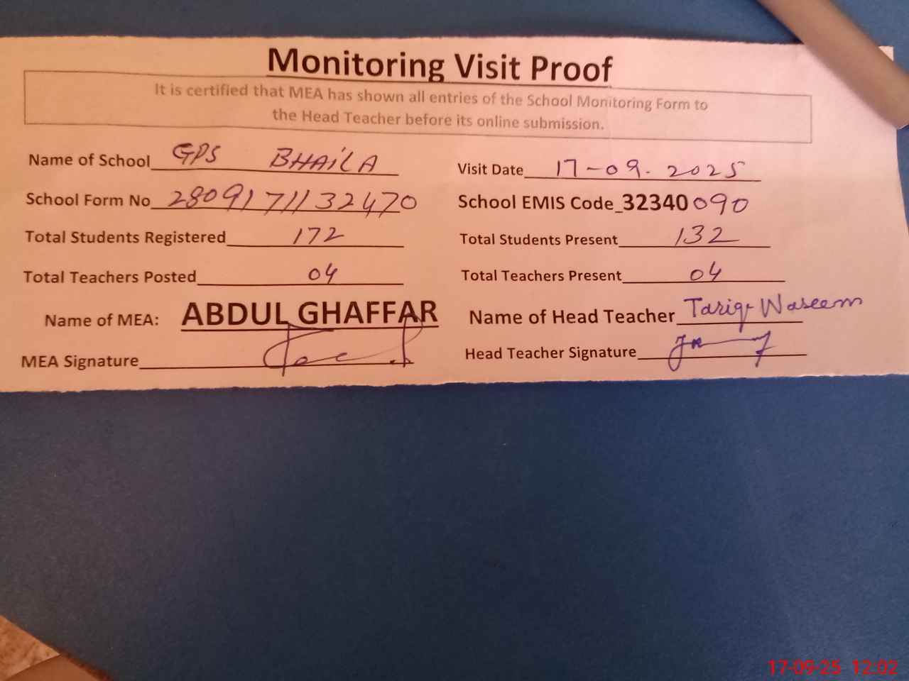 | Attendance Register | Head Teacher | MEA with School | Visit Proof |