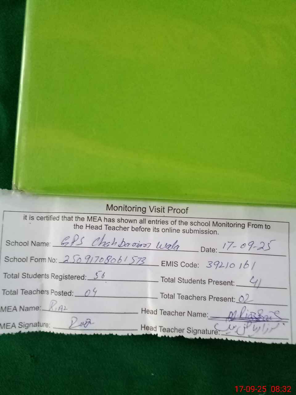 | Attendance Register | Head Teacher | MEA with School | Visit Proof |