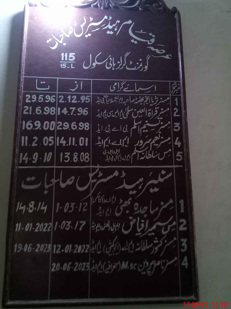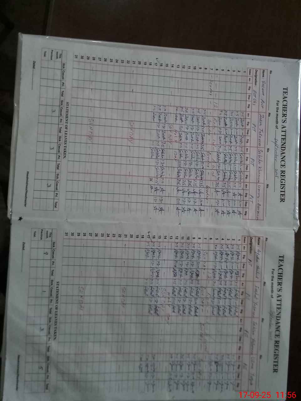 | Remarks (Use Separate Page if Required): PST Bushra khanwal Meternty leave applied but No Sanctioned PST Tahira Yasmin No leave applied and and No Sanctioned and on Attendance register his attendance columns are left blank from 01 September to till today on 17 September 2025 | |||||