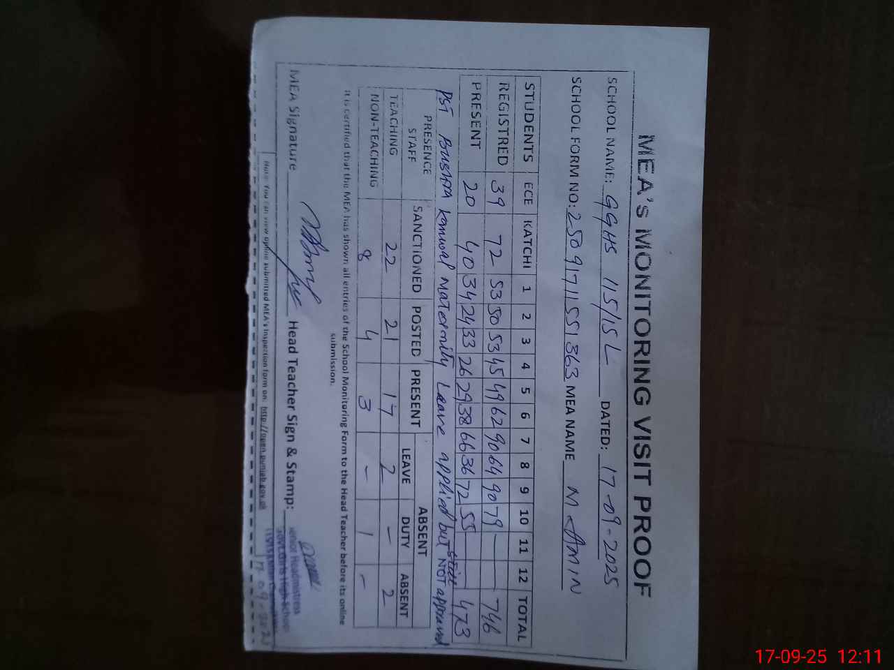 | Attendance Register | Head Teacher | MEA with School | Visit Proof |