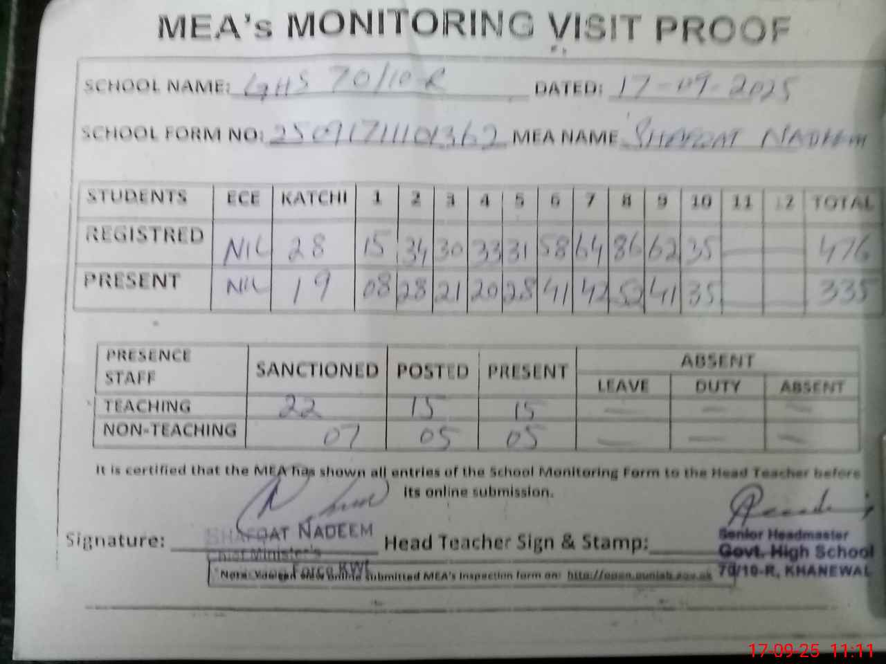 | EMIS Code: 36420013 | Name of School: GHS 70/10-R, KHANEWAL | |||