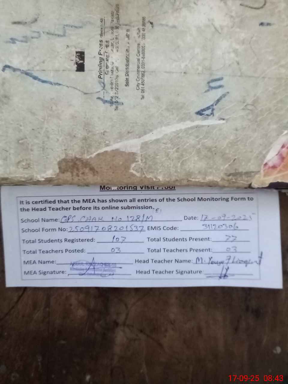 | EMIS Code: 31120306 | Name of School: GPS CHAK NO 128/M E | |||