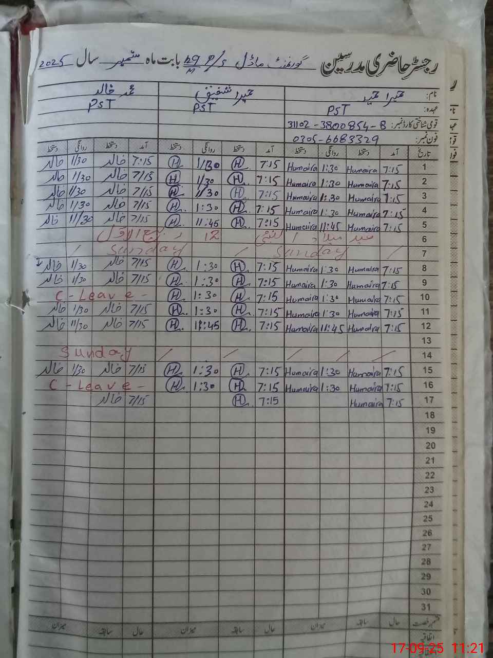 | CNIC | Full Name | Designation | R/C | Absence During Last Calender Month |