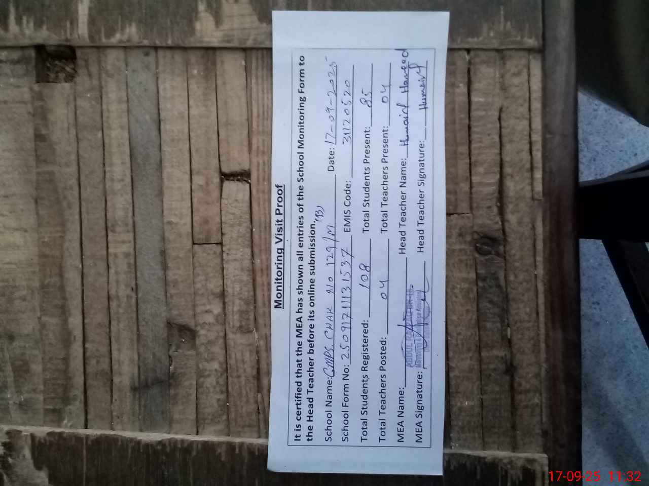 | Attendance Register | Head Teacher | MEA with School | Visit Proof |