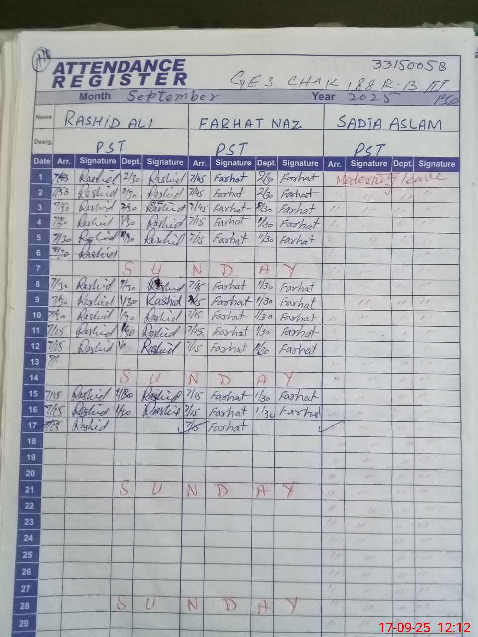 | CNIC | Full Name | Designation | R/C | Absence During Last Calender Month |