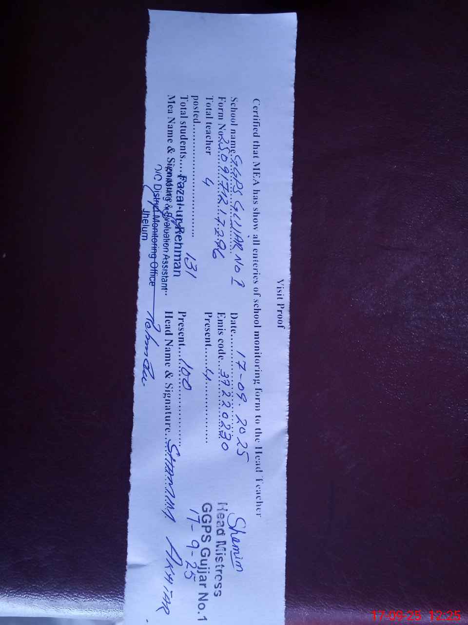 | Attendance Register | Head Teacher | MEA with School | Visit Proof |