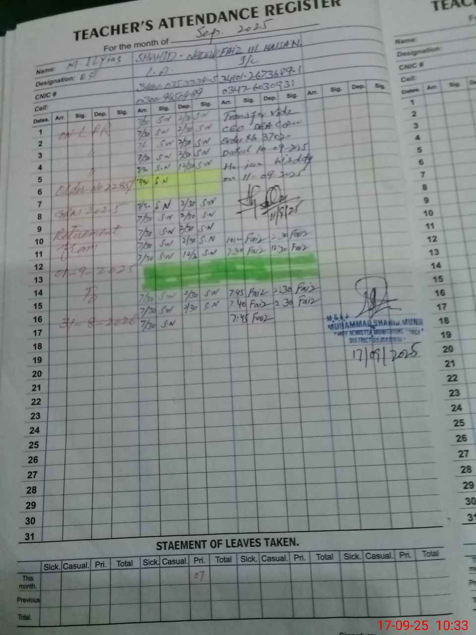 | Name: IH**** UL**** Designation: (School Headmaster's/Headmistress's) SST GEN Phone/Cell Number: 03**** |