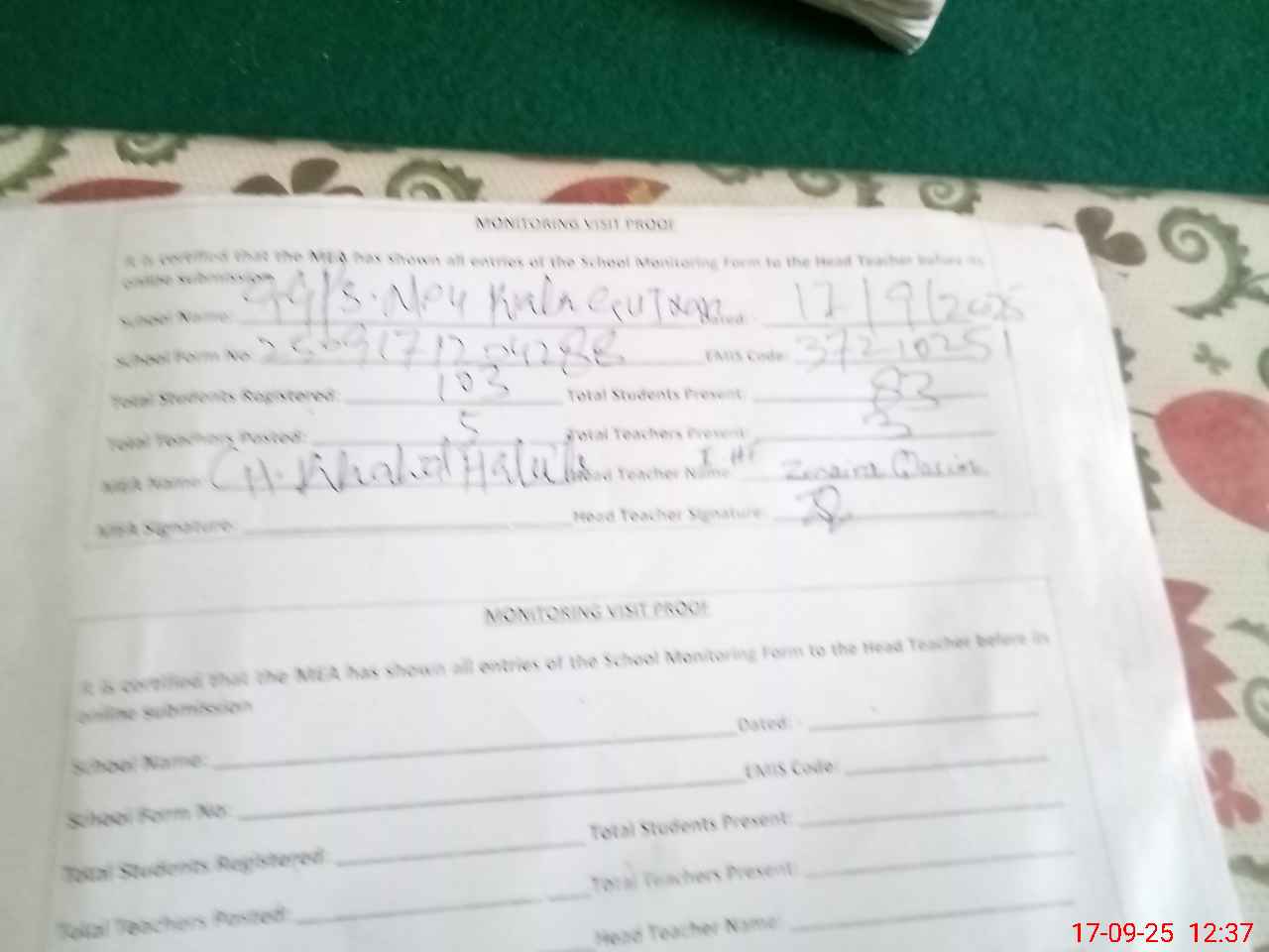| Attendance Register | Head Teacher | MEA with School | Visit Proof |