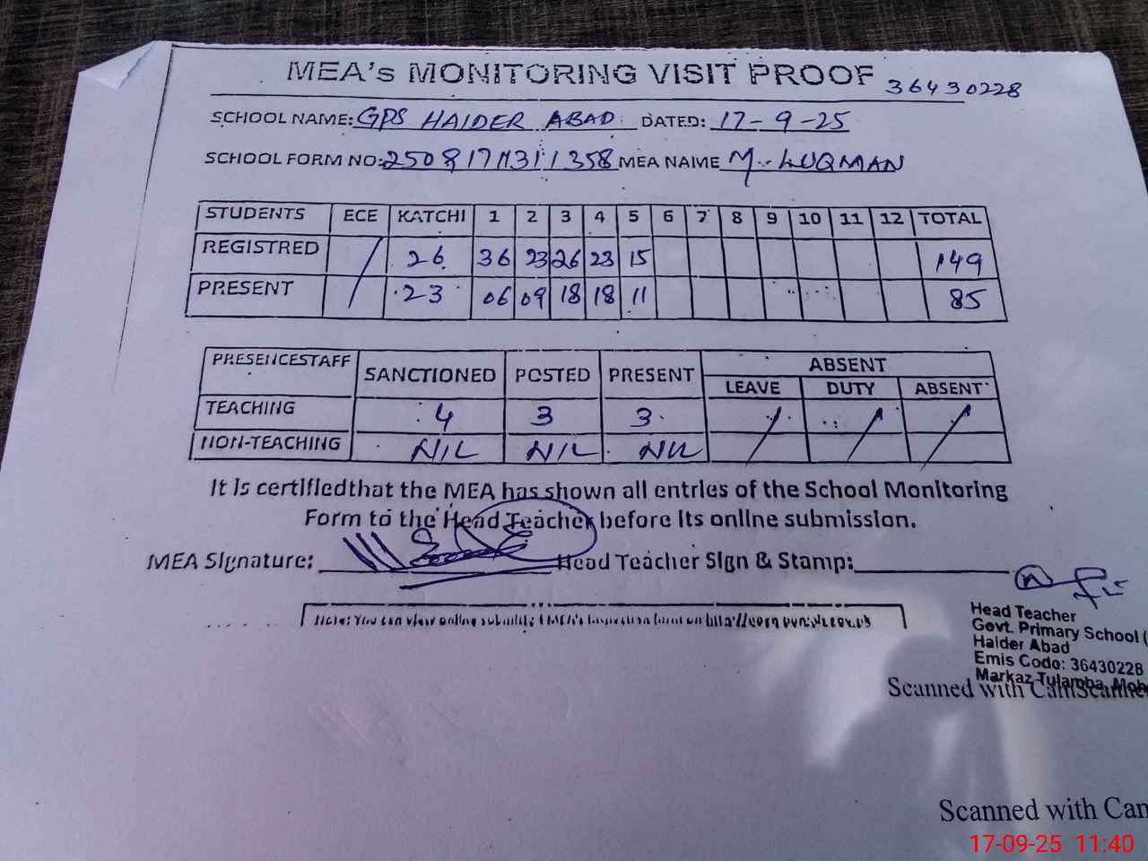 | EMIS Code: 36430228 | Name of School: GPS HAIDER ABAD, TULAMBA | |||