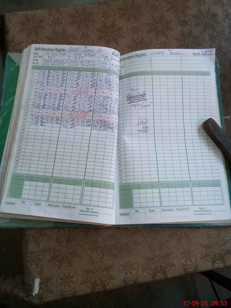 | CNIC | Full Name | Designation | R/C | Absence during last cal. month |