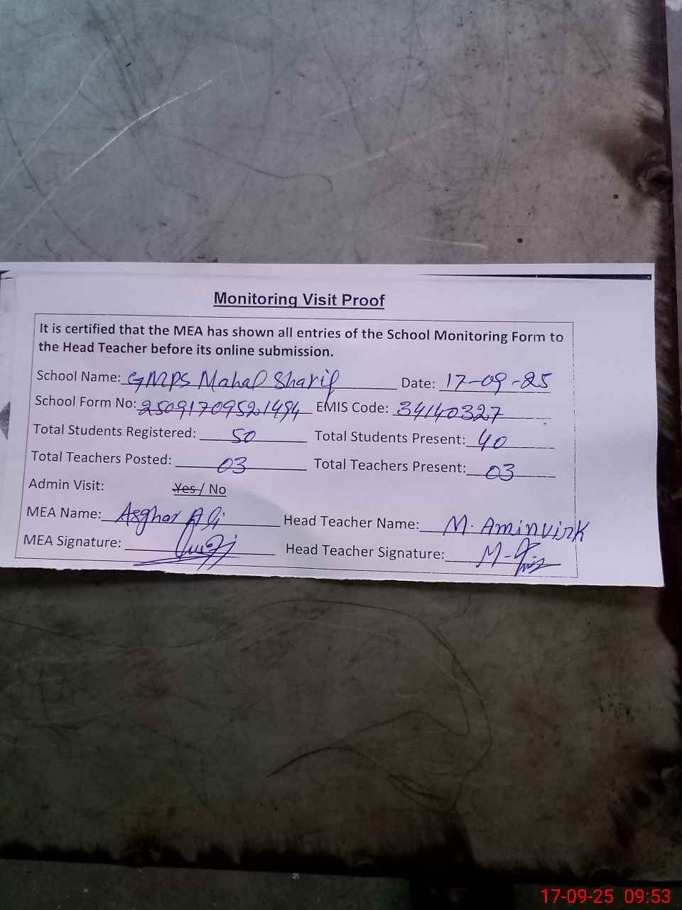 | Attendance Register | Head Teacher | MEA with School | Visit Proof |