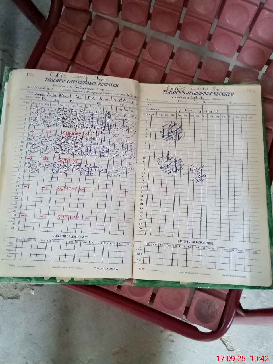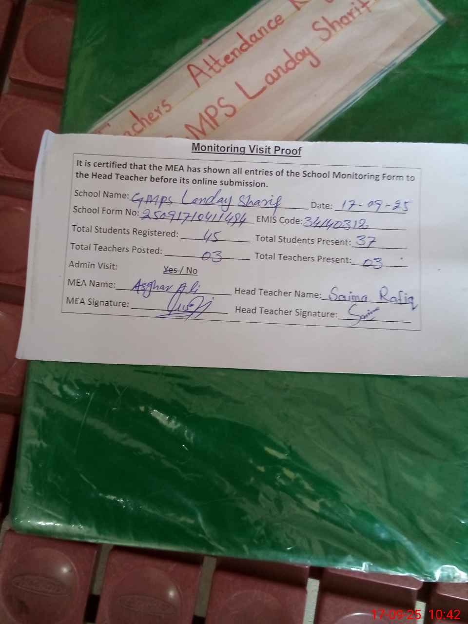 | Attendance Register | Head Teacher | MEA with School | Visit Proof |