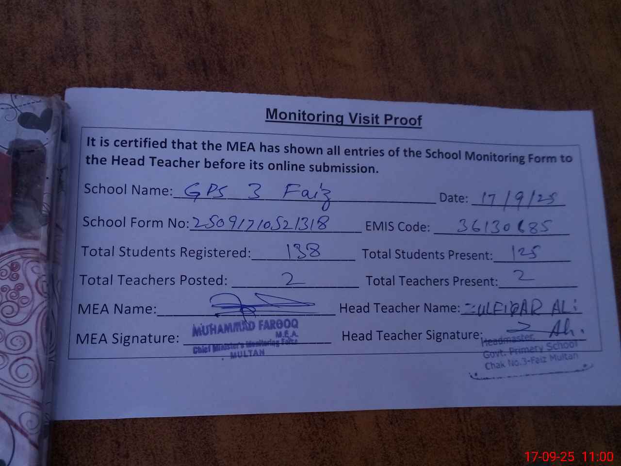 | Attendance Register | Head Teacher | MEA with School | Visit Proof |