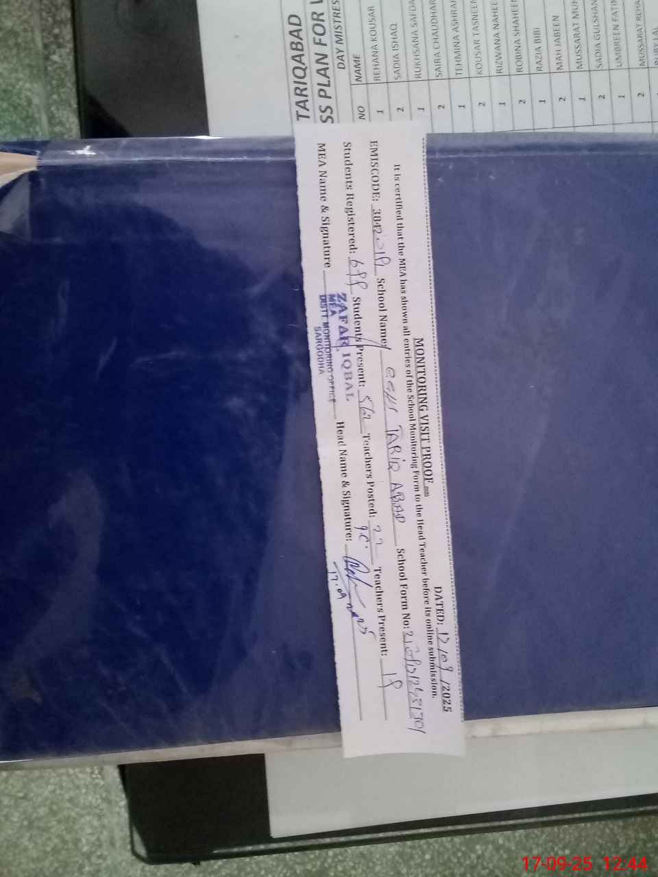 | Attendance Register | Head Teacher | MEA with School | Visit Proof |