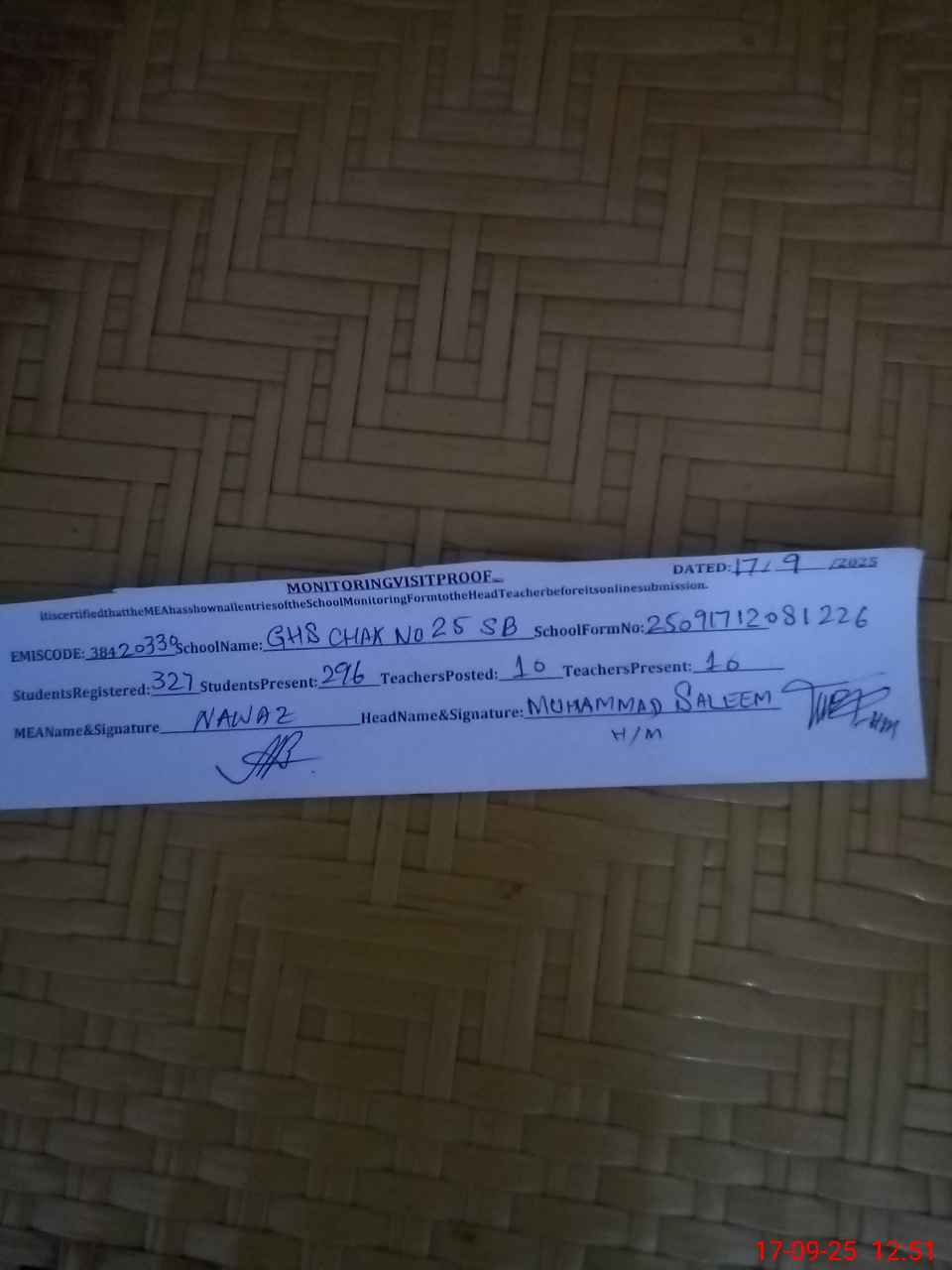 | Certified that this School was Inspected by the Undersigned MEA/DMO Today and the Information Stated Above is as Per Record. | |||||