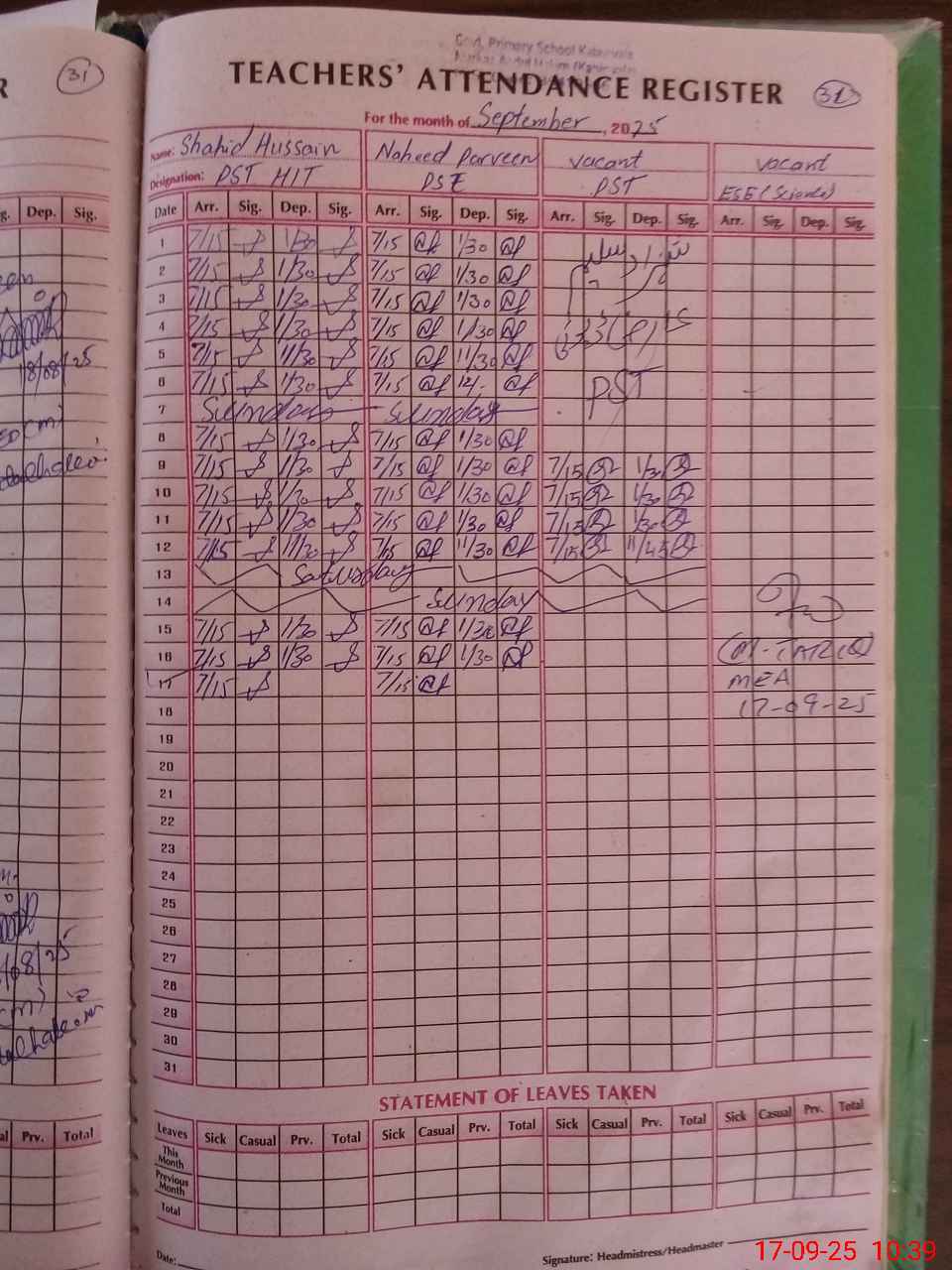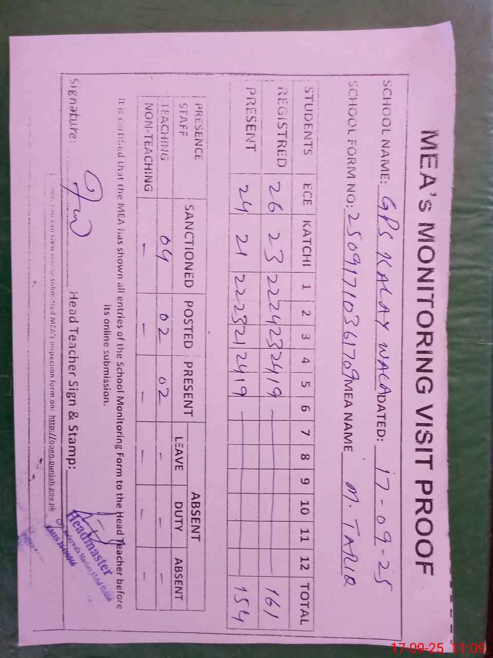 | Attendance Register | Head Teacher | MEA with School | Visit Proof |