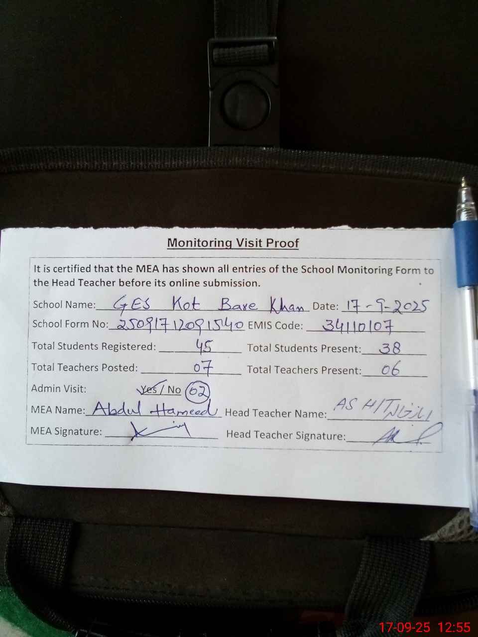 | EMIS Code: 34110107 | Name of School: GES KOT BARE KHAN | |||