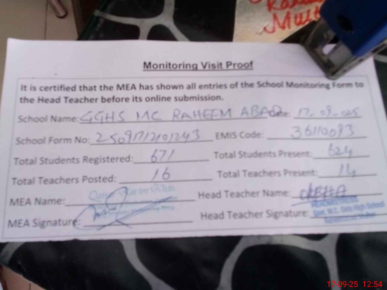 | EMIS Code: 36110093 | Name of School: GGHS MC RAHIM ABAD MULTAN | |||