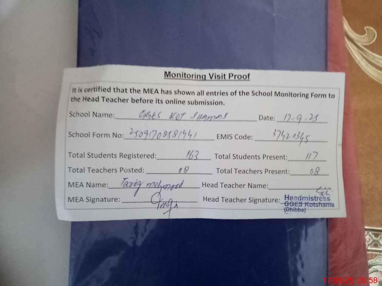 | Attendance Register | Head Teacher | MEA with School | Visit Proof |
