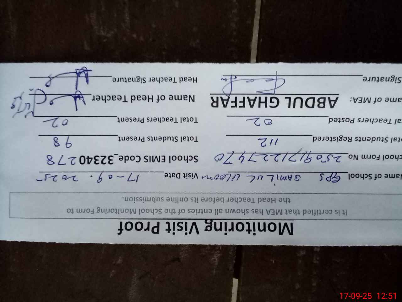 | Attendance Register | Head Teacher | MEA with School | Visit Proof |
